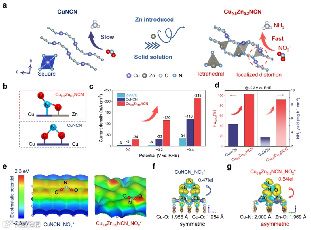 1. 创新催化剂设计与合成:成功合成Cu0.8Zn0.2NCN固溶体催化剂。该催化剂具有独特的局部结构扭曲特征,优化了表面静电势,实现了对NO2−的不对称吸附,为提升催化性能开辟了新途径。