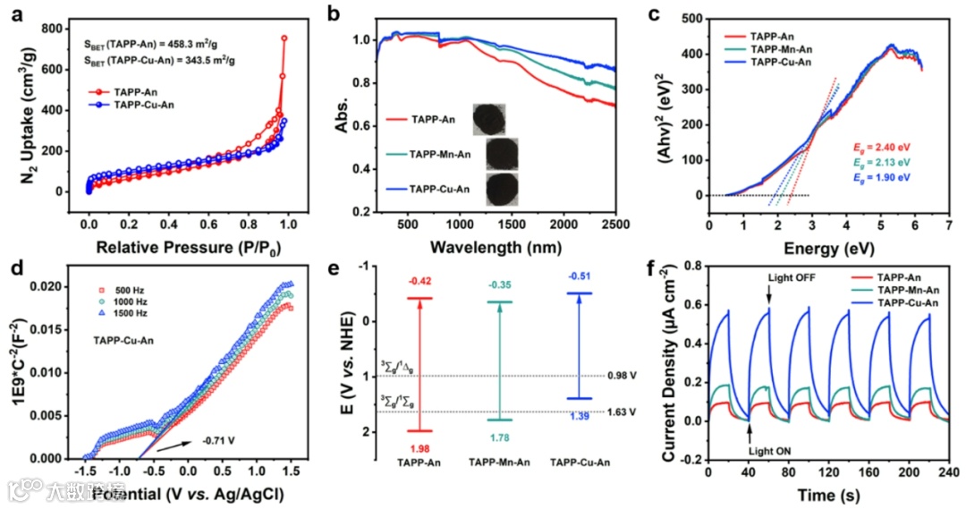 在77 K条件下的N2吸附-解吸测量结果表明,TAPP-An的Brunauer-Emmett-Teller (BET)表面积约为458.3 m2 g−1,孔径约为2.50 nm,这与理论结构模型的预测结果很好地吻合(图2a)。UV-Vis漫反射光谱(DRS)测量显示,这些COFs在200-2500 nm波长范围内表现出优异的光吸收,表明它们的光吸收范围可以覆盖整个紫外到红外区域(图2b)。利用Kubelka-Munk (KM)方法、Mott-Schottky (MS)测量确定了TAPP-An和TAPP- M-An (M = Mn, Cu)的价带导带位置(图2c-e)。这与紫外光电子能谱(UPS)测量结果相似。光电流响应测量结果表明,与其他两种样品相比,TAPP-Cu-An具有最高的瞬态光电流响应,表明其具有优越的电荷分离性能(图2f)。