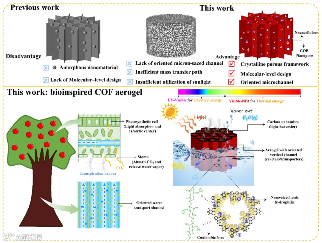 高效利用太阳能是解决能源危机和减少对化石燃料依赖的重要办法。将光热转换和光化学转换结合起来,同时利用天然海水生产淡水和高价值化学品,不仅能解决全球能源危机,还能有效缓解淡水短缺问题,这在缺水地区尤为重要。然而,现有的光热-光催化系统存在太阳能利用效率低的问题,因为它们要么缺乏定向的微米级通道来增强对太阳光谱的吸收,加快反应物和水蒸气的传质,要么缺乏合理的分子设计来有效降低水的蒸发焓。因此,开发能有效解决上述问题的创新型光热-光催化结构至关重要,但仍面临巨大挑战。