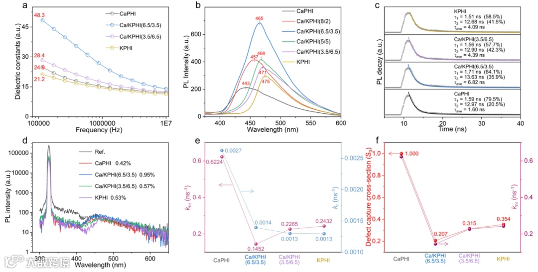 图3 CaPHI、Ca/KPHI(6.5/3.5)、Ca/KPHI(3.5/6.5)和KPHI频率依赖的介电常数(a)、稳态PL (b)、TRPL (c)、325 nm激光激发的PLQY (d)、计算的knr和kr(e)以及DCCS依赖的knr(f)。