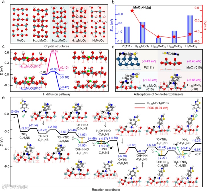 为了更深入地解析实验结果,本研究采用密度泛函理论(DFT)对多种HxMoO3物相的稳定性,及其表面反应机理进行了详细研究。首先,通过计算确定了HxMoO3晶体的最稳定结构(图4a),进而计算了其在实验反应温度下的形成吉布斯自由能,结果发现H0.93MoO3为最稳定的物相,与实验数据一致。进一步的计算发现,HxMoO3晶体中的H原子结合能与其相转变之间存在直接关联(图4b),特别是H0.93MoO3与H1.68MoO3之间的可逆性转变。H原子在H1.68MoO3(010)表面上的迁移能垒计算(图4c),进一步证明其快速的氢溢流使得H1.68MoO3成为了一种高效的氢储存库,有助于氢的释放以促进加氢反应。吸附研究进一步显示(图4d),H1.68MoO3(010)表面更倾向于吸附5-硝基苯并噻唑的-NO2端,有效避免了Pt表面的硫中毒。反应路径分析揭示(图4e),5-硝基苯并噻唑在H1.68MoO3(010)表面的加氢过程涉及N-O键解离形成表面*O和氢迁移脱除*O,并确定了通过H扩散在氧空位上脱除第二个*O原子形成*OH的过程为速率决定步骤,其势垒为0.94 eV。综上所述,由于H1.68MoO3(010)独特的H质子储存和释放性能,不仅促进了5-硝基苯并噻唑氢化过程中N-O键的断裂,而且有效防止了Pt的硫中毒,为开发更高效的催化剂和优化有机化合物氢化反应路径提供了新的见解。