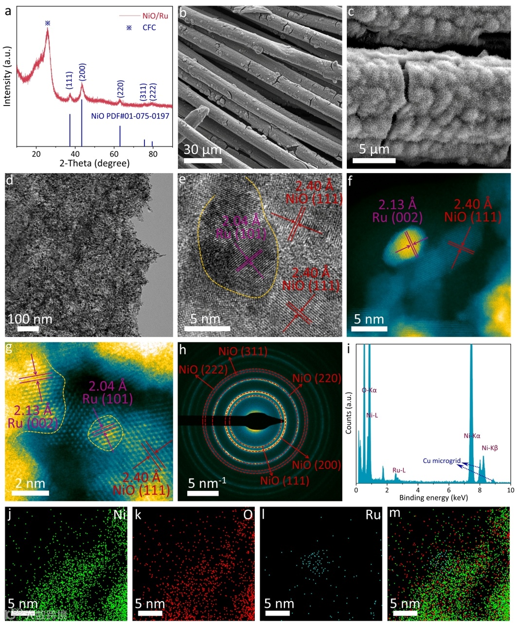 采用水热法构建Ni基纳米针前驱体,随后在400 ℃下退火两小时制备出具有相互连接的NiO三维网络结构。最后,利用循环伏安法电沉积制备NiO/Ru催化剂。其SEM和TEM(图1)结果表明,纳米网络结构在基板上生长均匀,负载Ru纳米团簇与NiO载体具有清晰的界面。ICP-AES进一步测定NiO/Ru异质结中Ru含量为4.0 at.%。
