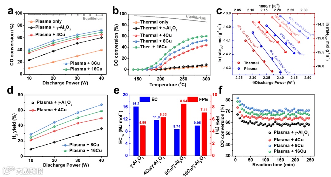 结合图2a和2b,表明等离子体催化在140 oC以下就能实现较高的CO转化率,而热催化WGS在如此低的温度下难以发生。图2c显示了相较于热催化,等离子体催化WGS具有更低的表观活化能。图2d和2e表明等离子体催化WGS有较高的产氢率及能量效率。图2f表明等离子体催化WGS在4小时内的稳定性较好。
