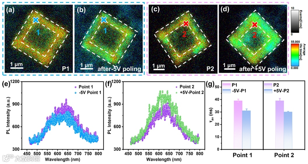 2. 利用“时间-空间”分辨单颗粒荧光光谱寿命成像技术,原位监测了异质结不同微纳区域光生载流子传输及复合过程,并研究了极化方向对光生载流子分离效率的影响。