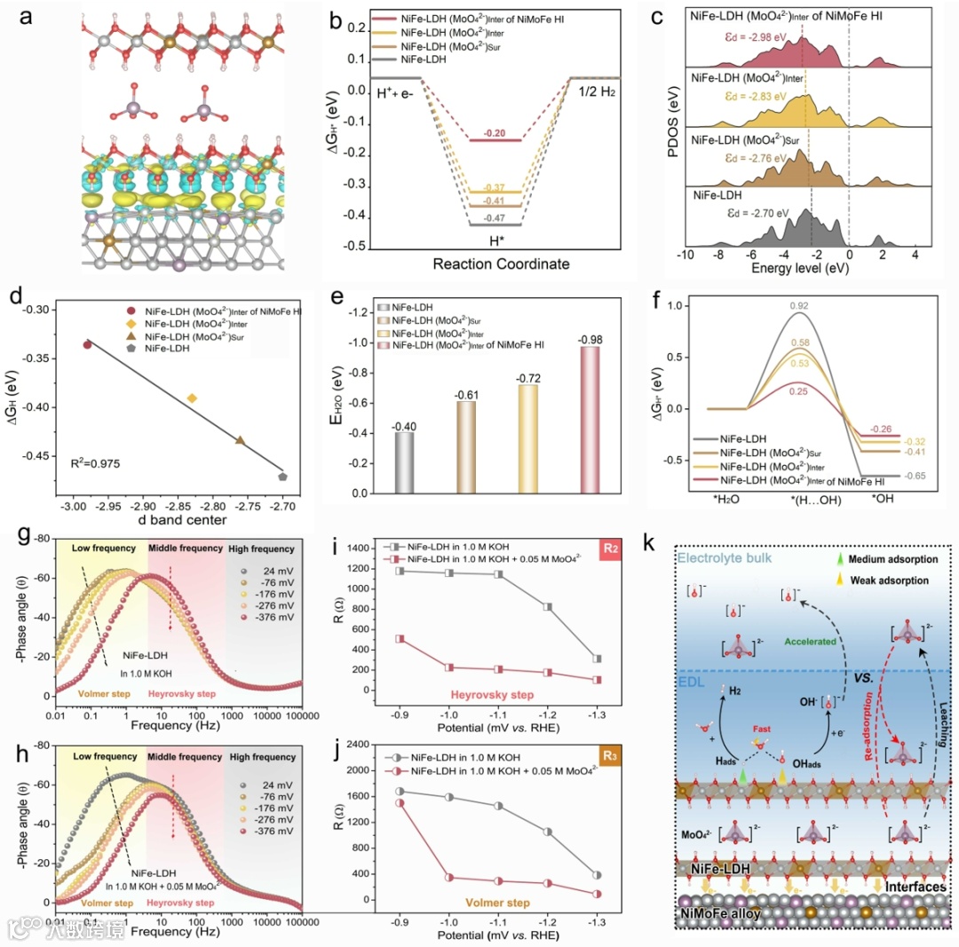图4 (a) NiMoFe HI模型的差分电荷密度,黄色和蓝色等高线分别表示电子积累和消耗;(b) 催化剂模型的∆G*H;(c) 过渡金属Ni+Fe 3d轨道的PDOS;(d) G*H与催化剂模型的d带段中心的关系;(e)不同催化剂模型上的H2O吸附能;(f) 不同催化剂模型上H2O解离和*OH吸附的自由能;(g,h) NiFe-LDH分别在1.0 M KOH和含0.05 M MoO42- 的1.0 M KOH中不同过电位(vs. RHE)下的Bode图;(i,j) 等效电阻 R2和R3与电位的相关性;(k) 碱性HER期间NiMoFe HI表面双层电内外的物种状态示意图。