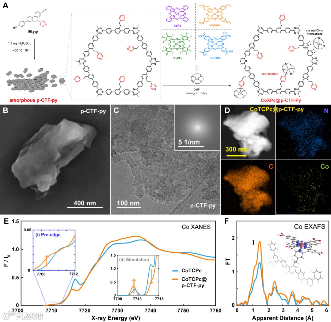 图1.(A)分子杂化催化剂的合成方案;(B-E)有机半导体及分子杂化催化剂的基本表征;(F)CoTCPc@p-CTF-py的DFT计算结构。