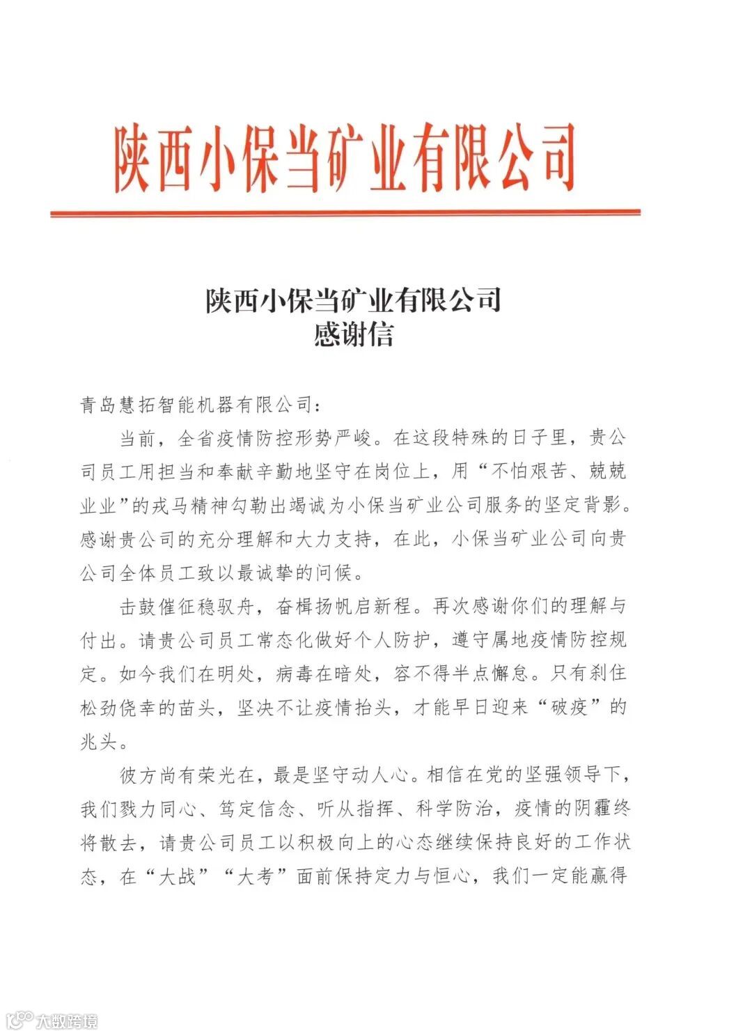 为深入贯彻落实党的二十大精神,积极践行绿色发展战略。在当前疫情防控的复杂形势下,为保障设备平稳运行和矿区生产安全,慧拓一线员工在保证个人防护的前提下坚守岗位,以积极的工作状态面对困难与挑战,收获了客户伙伴的一致好评。陕西小保当矿业有限公司特致信感谢慧拓的理解和支持,慧拓员工的担当与辛勤奉献,用“不怕艰苦、兢兢业业”的戎马精神勾勒出竭诚为小保当矿业服务的坚定背影,助力小保当的“保”供担“当”。