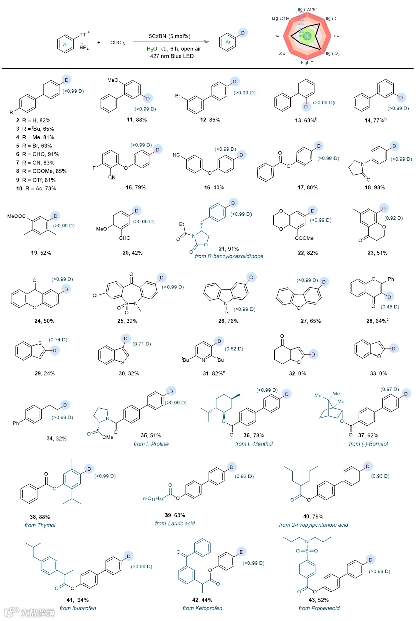研究显示,来自简单联苯的多种噻蒽鎓盐在温和反应条件下均适合用于氘化反应,生成了多种具有不同官能团的氘化产物,收率在63%至91%之间,氘的引入率超过99%。该方法能够在联苯的2位或3位引入氘,且对芳香醚和酯化合物也表现出良好的适用性。尽管某些含杂环的底物如呋喃和苯并呋喃不适合该反应,其他天然产物衍生物如L-薄荷醇和香芹醇等则显示出良好的反应性。规模放大实验结果表明,产物的收率也保持在可接受范围,例如产物2和9收率分别为71%和61%。此外,研究发现反应浓度、氧气水平和光强度是影响反应重现性的关键因素。