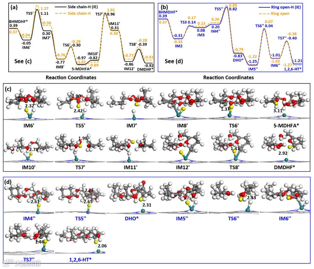 图4a和4d给出了BHMF环加氢反应的势能面和结构图。通过计算发现环加氢反应的顺序为C2-C3-C4-C5,第一步是决速步骤 (能垒为0.82 eV,反应吸热0.30 eV)。BHMF的侧链氢解反应如图4b和4e所示,氢原子进攻OH导致C-O键断裂并生成H2O(IM1')。随后CH2和氢原子共吸附在Ru上生成产物5-MFA (决速能垒0.98 eV)。而进一步发生另一端氢解反应生成DMF则需要克服能垒1.15 eV。图4c和4f给出了BHMF的加氢开环反应生成1,6-二羟基己-3-烯-5-酮(DHEO)和1,6-二羟基己-5-酮 (DHO)。在此过程中形成DHEO的步骤为决速步,整体决定能垒为1.89 eV。综上,BHMF通过环加氢生成BHMTHF将是最有利的路径。