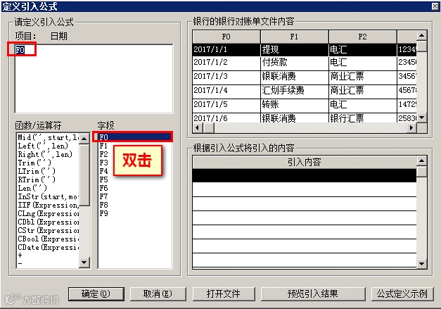 【6】给日期字段定义公式:根据【银行的银行对账单文件】内容字段一一匹配。例如,银行的银行对账单文件内容”中F0为日期,那么定义“日期”公式时,在“字段”中双击F0即可,如图: