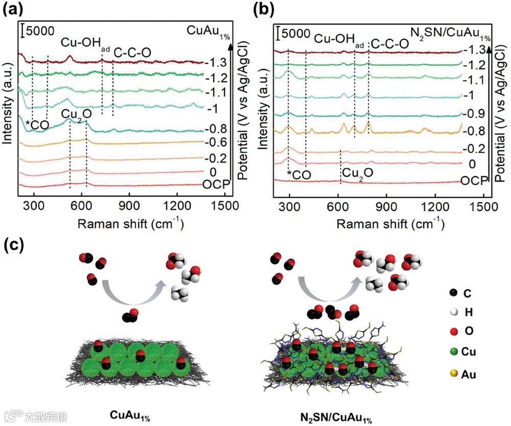 2. N2SN/CuAu1%中铜的价态(Cuδ+,0 < δ < 1)来源于N2SN分子的吸电子特性,可调控铜的价态并指向C2+/acetate的生成。原位拉曼也表明N2SN有利于生成更多的*CO 和C-C-O 中间体分别用于进一步的C-C耦合和醋酸盐的生成。