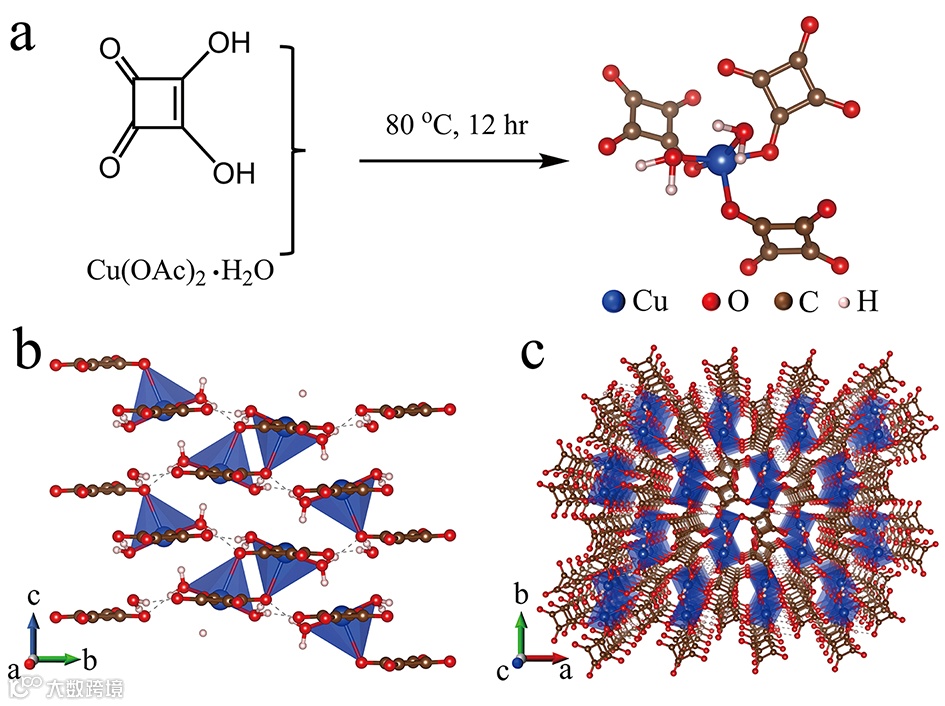 Figure 1. (a) Illustration of the solvothermal synthesis of C4O4-Cu. Structure of C4O4-Cu (b) single layer and (c) multilayers along different directions.