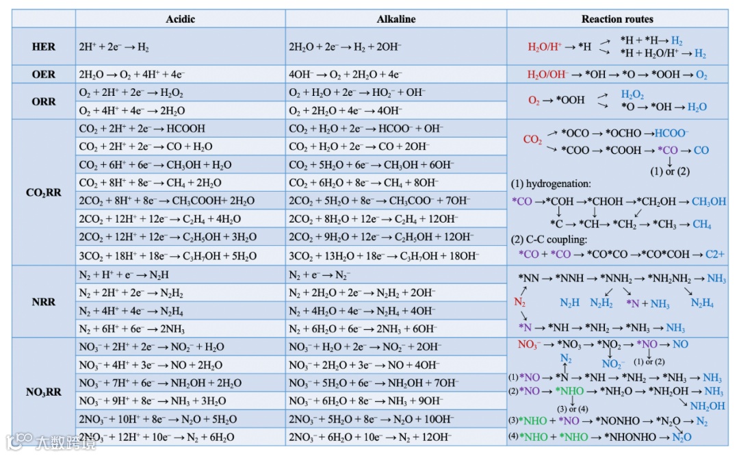 表1. 重要的电催化反应 (红色:反应物,蓝色:产物,紫色和绿色:关键的反应中间体)