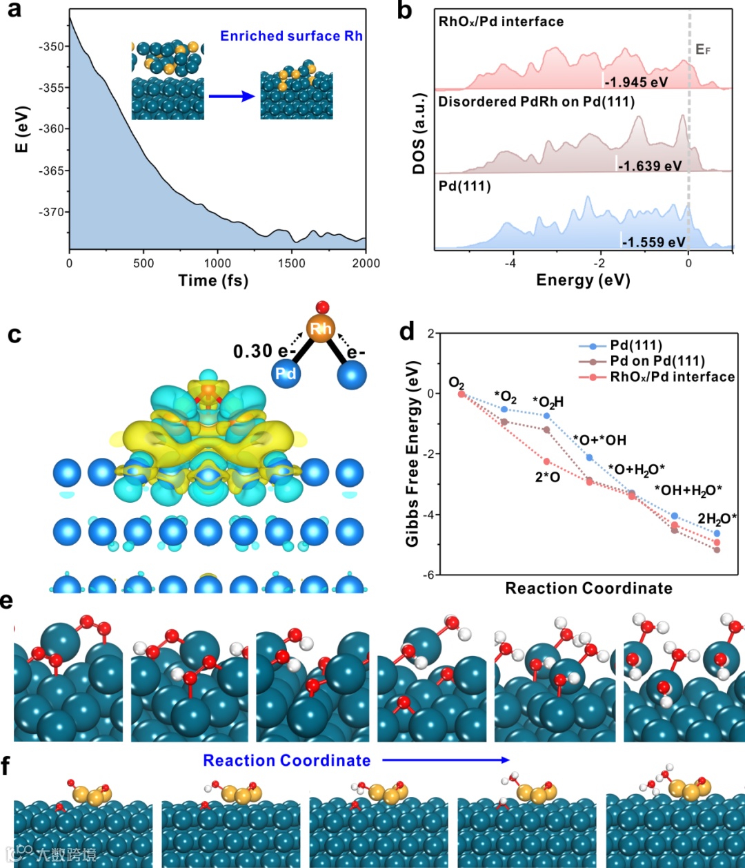 3. 深入的催化机制研究:通过详细的能量谱分析和理论模拟,确认了RhOx/Pd界面可以引起表面电荷重新分布,有助于减弱反应中间体物种的吸附强度,从而显著提升ORR动力学。同时,抗腐蚀的Rh/RhOx物种可以有效阻止Pd原子的氧化溶出,进一步增强了催化剂的耐久性。