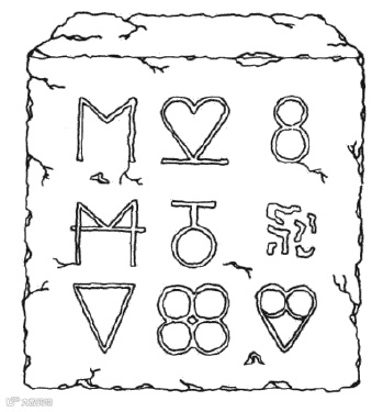 这块儿神谕古文石是在冰岛的胡萨威克发现的,它曾经吸引很多考古学家前来研究,直到有个上学的小男孩告诉他们那不过是个赝品而已,考古学家们才恍然大悟,原来上面描述的正是一个著名的思维游戏。凿在石头上的是9个秘密字母。上图中的第六个字母(即中间那行第三个字母)故意没有完成。这个游戏就是要猜出来那个字母是什么。而你只有先确定其他字母所代表的事物,才能把那个字母猜出来。