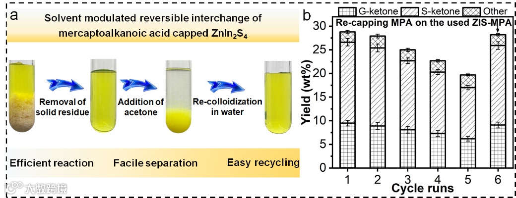 通过向反应体系中注入过量丙酮可使胶状ZIS-MPA团聚并易从反应体系中分离(图4a)。尽管循环后ZIS-MPA对原生木质素的解聚活性有所下降,以及体系中检测到的少量二硫化物表明,活性的下降是由于部分MPA配体从ZIS表面脱离而造成的。不过,DMPO结果表明该二硫化物在光照ZIS上可重新诱导RS·的生成。另外,当恢复使用过的ZIS-MPA表面配体浓度后,也显著恢复了其对原生木质素解聚的活性(图4b)。故使用巯基烷酸为配体的超薄ZIS微米带解聚原生木质素的优点不仅在于巯基烷酸在光照ZIS下可生成选择性断β-O-4键的RS·,还可归因于其胶状性质,使催化剂与固体原生木质素之间能够良好接触以促进反应的高效进行。