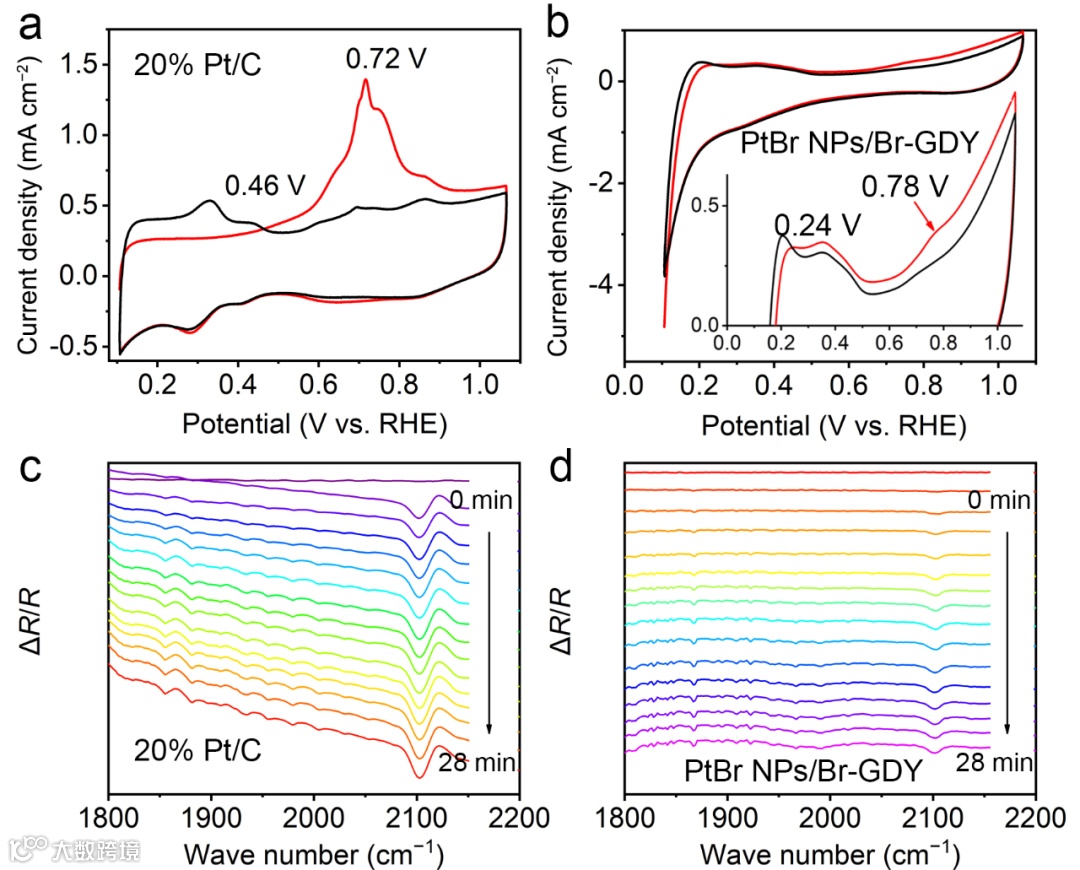 图4. PtBr NPs/Br-GDY的CO中毒测试及原位红外表征