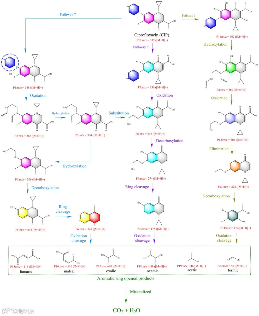 3. 本文结合一系列实验表征与理论计算结果证明,确定了H2O2产生的最佳途径和降解机理,进一步阐明了CIP的降解途径和毒性分析。