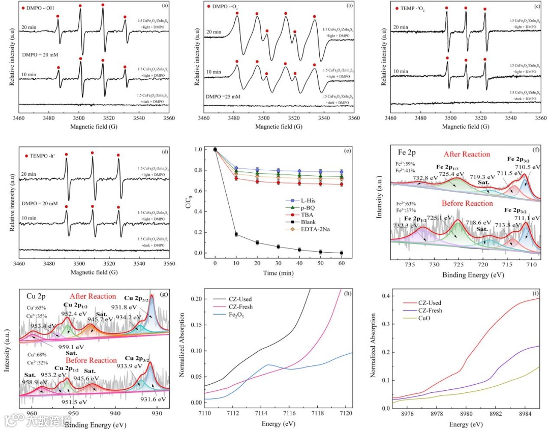 在可见光照射下,光生电子(e-)和空穴(h+)分别积聚在CuFe2O4和ZnIn2S4的CB和VB上。在内部电场(IEF)的驱动下,ZnIn2S4的CB上的电子与CuFe2O4的VB上的空穴复合。在ZnIn2S4的VB上积累的空穴的氧化电势(1.98 eV)低于OH-/·OH(1.99 eV)和H2O/·OH(2.27 eV),因此它们不能通过氧化H2O和OH-产生·OH,而是直接参与CIP降解。值得注意的是,CuFe2O4/ZnIn2S4异质结中的Fe2+和Cu+是可以激活H2O2产生·OH的主要活性位点,伴随着Fe3+和Cu2+的产生,而H2O2的还原作用几乎可以忽略不计。在CuFe2O4的CB上积累的具有强还原能力的电子可以实现Fe3+和Cu2+的还原。Fe3+/Fe2+和Cu2+/Cu+的循环可以促进H2O2的快速分解,从而为CIP降解产生大量的活性物质。此外,在CuFe2O4的CB上积累的电子也可以与吸附的O2反应生成·O2-,其中一小部分·O2-直接降解CIP,大部分·O2-用于生成1O2。最后,CIP被降解成小分子或直接矿化成CO2和H2O。