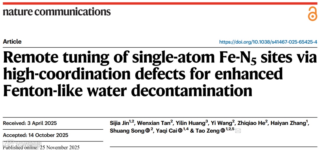 Jin, S., Tan, W., Huang, Y. et al. Remote tuning of single-atom Fe-N5 sites via high-coordination defects for enhanced Fenton-like water decontamination. Nat Commun 16, 10455 (2025).