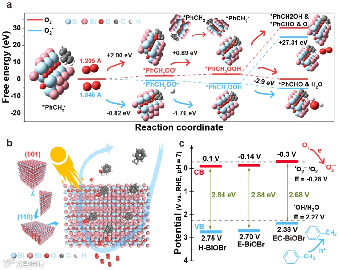 在TEM、XRD等表征结果的基础上搭建了合理的计算模型,利用第一性原理计算及量子化学计算,模拟了苄基自由基向苯甲醛转化的可能路径。结果表明,相较于氧气直接氧化路径,超氧自由基氧化路径是热力学可行的,进一步证明了超氧自由基在EC-BiOBr光催化甲苯选择性氧化过程中的重要作用。