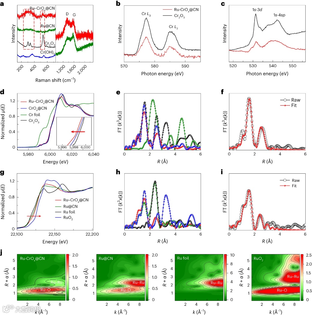 图6. 机理研究。a,Ru–CrOx@CN(红色)和Ru@CN(绿色)的0.5 mA cm−2过电位与pH的关系线性图。b,Ru–CrOx@CN的原位EIS的Bode相位图。c,由氢吸附电阻 R2 获得的 Ru–CrOx@CN(红色)和 Ru@CN(绿色)催化剂的 EIS 塔菲尔图。d,Ru–CrOx@CN(红色)和 Ru@CN(绿色)催化剂在 0.1M KOH 和0.1M KOD 水溶液中的动力学同位素效应值与电势的关系。e,Ru/Ru2CrOx的Cr、Ru和O原子的PDOS图。f,Ru簇和Ru2CrOx簇之间的差分电荷密度分布。颜色表示:灰色,Ru;蓝色,Cr;红色,O。黄色和橄榄色分别表示电荷分布的增加和减少。g,在不同模型中,Ru上的H吸附能和CrOx上的OH吸附能。h,Ru、Ru/Ru1CrOx和Ru/Ru2CrOx上氢氧化成H2O的计算能垒。星号(*)表示活性位点。