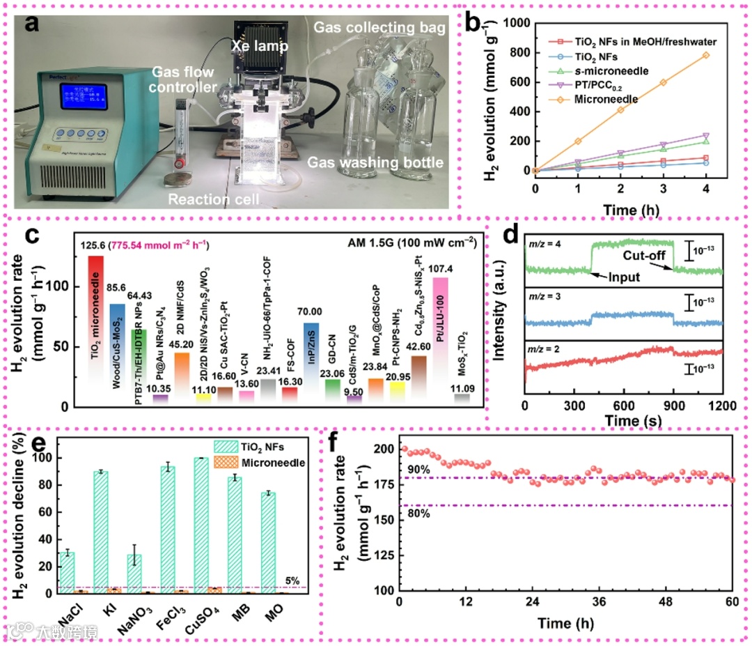 图4. 微针形反应器件上的光催化水蒸气裂解。(a) 光催化水蒸气裂解系统的照片。(b) 样品的光催化析氢速率。(c) 微针形反应器件与不同粉末光催化剂或光催化器件析氢速率的比较。(d) 反应产物的电化学微分质谱信号。(e) 微针形反应器件或 TiO2 NF 粉末在不同污水中光催化析氢的下降率。(f) 微针形反应器件的稳定性。