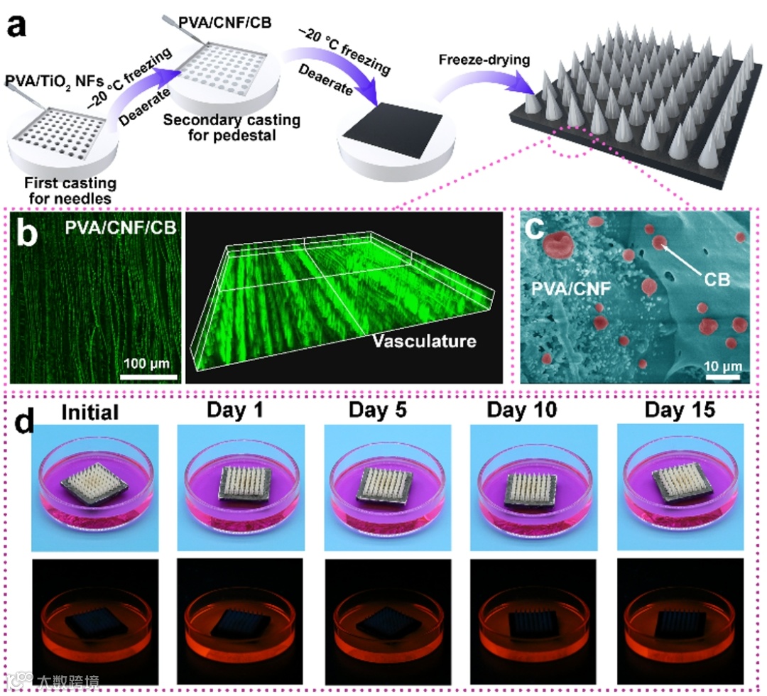 图1. 微针模块的制备及光热底座的超疏水性。(a) 微针反应器件制备流程图。(b) 0.01%荧光素钠染色的 PCC0.2 共聚焦图像。(c) PCC0.2 气凝胶的伪彩SEM图像。(d) 微针超疏水性的展示照片。