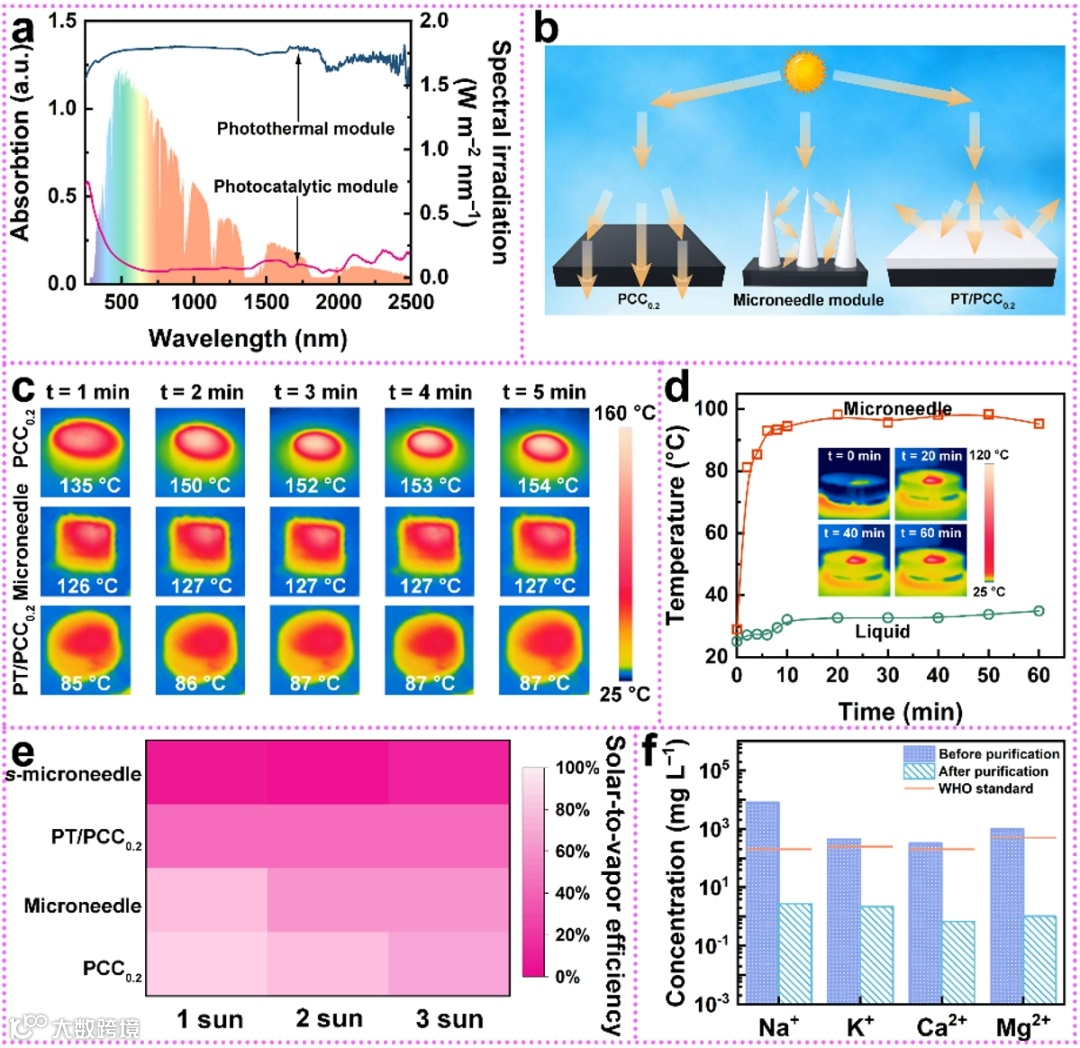 图3. 界面太阳能加热和蒸汽产生。(a) 光催化和光热气凝胶的 UV–vis–NIR 光谱。(b) 各类器件的光吸收示意图。(c) 各器件在 3 sun 照射下的红外图像。(d) 微针反应器件和溶液体相温度的时间演变曲线。(e) 不同样品的太阳能–水蒸气转化效率。(f) 脱盐后淡水中四种主要离子的浓度。