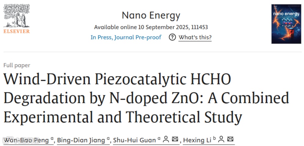 综上所述,该研究通过一种新颖的超临界溶剂热法开发了氮掺杂锌氧化物(N-ZnO) 压电催化剂,并在风驱动压电催化降解HCHO过程中表现出优异的高效性和稳定性。与ZnO相比,N-ZnO的压电催化活性提高了五倍。且实验结果和理论计算均表明,氮掺杂会引起晶体畸变,从而增强压电响应,通过偶极矩增大促进了HCHO 吸附,并降低了反应能垒。这项工作不仅提供了压电催化降解HCHO机制的原子水平见解,同时还提出了一种可扩展的、独立于能源的深度空气净化和自清洁策略—通过将 N-ZnO 装饰在车辆的外表面,提供了一个可持续的自主供能环境技术路径。