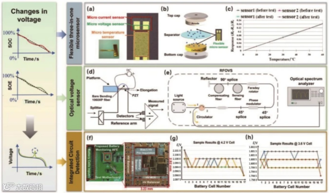- 柔性三合一微传感器(MEMS):植入电池内部同步测温度/电压/电流,厚度58 µm,电压误差0.001-0.006 V。