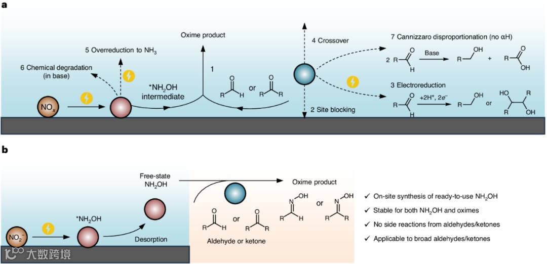 图1. 电合成肟的不同路线比较。a, 以前的研究:利用吸附态*NH2OH的“一步肟化法”。除了*NH2OH与醛/酮发生肟化反应(路径1)外,还可能发生其他负面效应,包括醛/酮底物阻塞活性位点(路径2),醛/酮电还原为醇(路径3),醛/酮底物及产物的穿梭(路径4),原位产生的NH2OH过度还原(路径5)。并且在碱性条件下,会发生NH2OH的降解(路径6)及无α-H醛的降解(如坎尼扎罗歧化;路径7)。b, 本工作:在中性条件下,利用游离态NH2OH的“两步肟化法”。通过解耦NH2OH生成与肟化,能避免路径2-4的发生;在中性反应条件下,NH2OH降解(路径6)与醛降解(路径7)能够被避免。