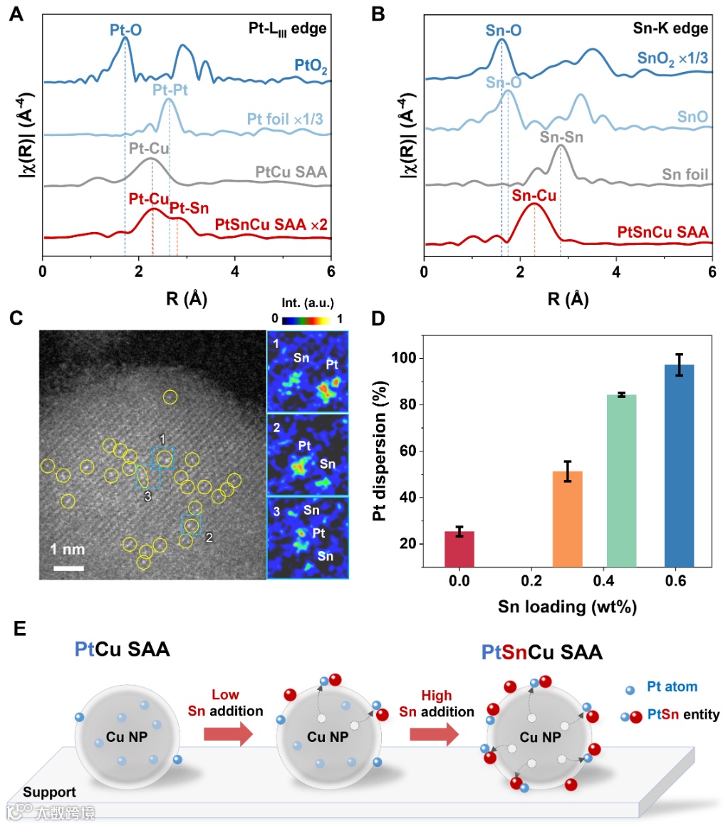 1. XAS和AC-HAADF-STEM证实Pt在PtCu和PtSnCu中均为单原子形式,PtSnCu中形成稳定的Pt1Sn1二聚体,且无Pt–Pt或Sn–Sn配位。