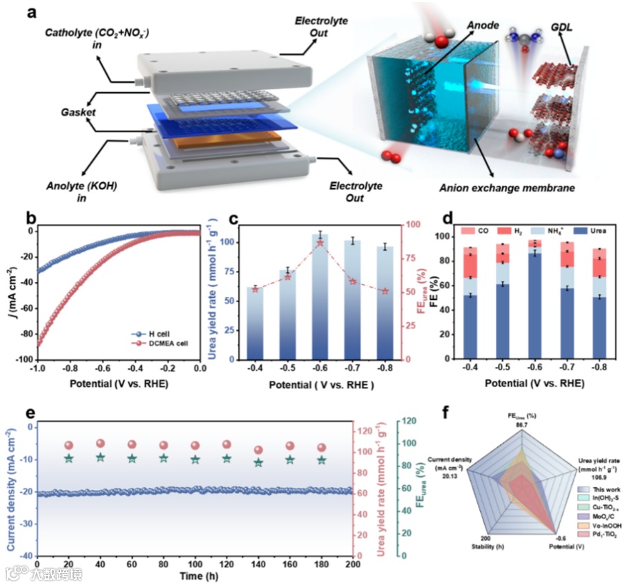尿素是肥料和化学品中重要的氮载体。其传统尿素生产主要依赖于Bosch-Meiser工艺,该过程不仅需要苛刻的条件,更消耗了全球约2%的能源,并导致严重的环境负担。N2与CO2的电催化协同还原为可持续尿素生产提供了一条有前景的途径,但其实际可行性受到强N≡N键(941 kJ mol-1)和超低N2溶解度的阻碍,导致尿素法拉第效率(FEurea)普遍较低。与N2相比,NOx-具有较弱的N=O键(204 kJ mol-1)和更好的水溶性,使其成为尿素电合成中理想的替代氮源。然而,NOx- 原料主要依赖高碳排放的奥斯特瓦尔德工艺,从而影响了电催化合成的可持续性和脱碳性。因此,迫切需要开发一种替代技术,能够在可持续且低能耗的条件下实现大规模尿素生产,成为当前研究的重点。