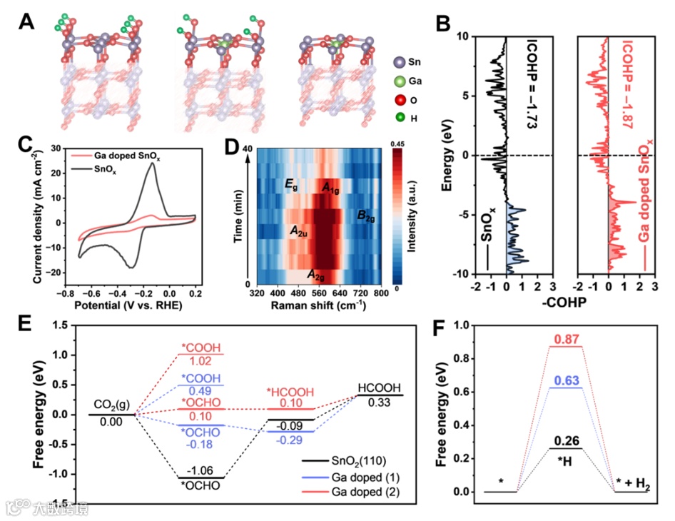 8月20日,西湖大学理学院、人工光合作用与太阳能燃料中心张彪彪课题组、王涛课题组针对酸性电催化CO2还原制备甲酸反应取得了重要突破。研究团队提出了一种SnO2结构稳定性的调控策略,通过Ga掺杂稳定SnO2晶格氧结构,从而有效阻碍Snδ+在反应中的自还原过程,提高催化剂稳定性。同时,Ga的引入可有效调控CO2还原中间体在催化剂上的吸附强度,进一步提升催化活性。因此,Ga掺杂的SnO2催化剂(Ga0.85SnOx)在pH=1.7的电解液以及−1.63 VRHE电位下,实现了甲酸(HCOOH)分电流密度(jHCOOH)大于440 mA cm−2,最大单程碳转化效率(SPCE)达到91.9%。在10 cm2的固体电解槽中,催化剂可持续运行4000 h以上,总电流达到986.3 mA,甲酸法拉第效率(FEHCOOH)大于82% ,具有突出的工业应用前景。