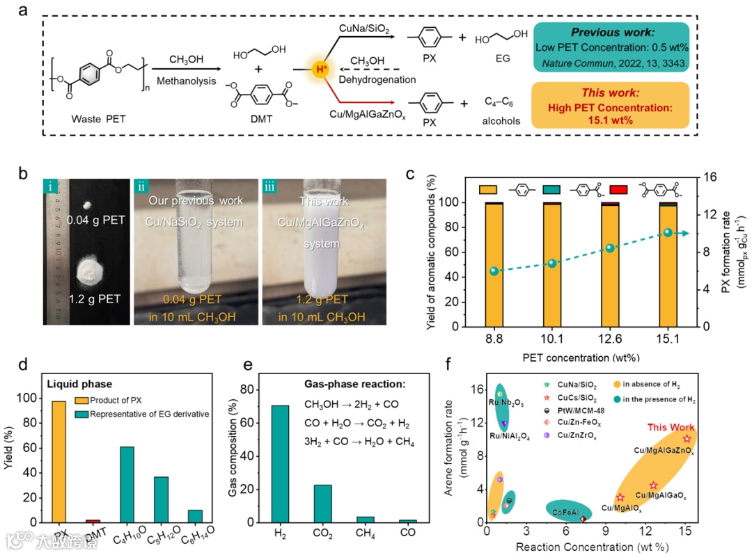 图1. Cu/MgAlGaZnOx上PET升级回收的示意图和催化性能。