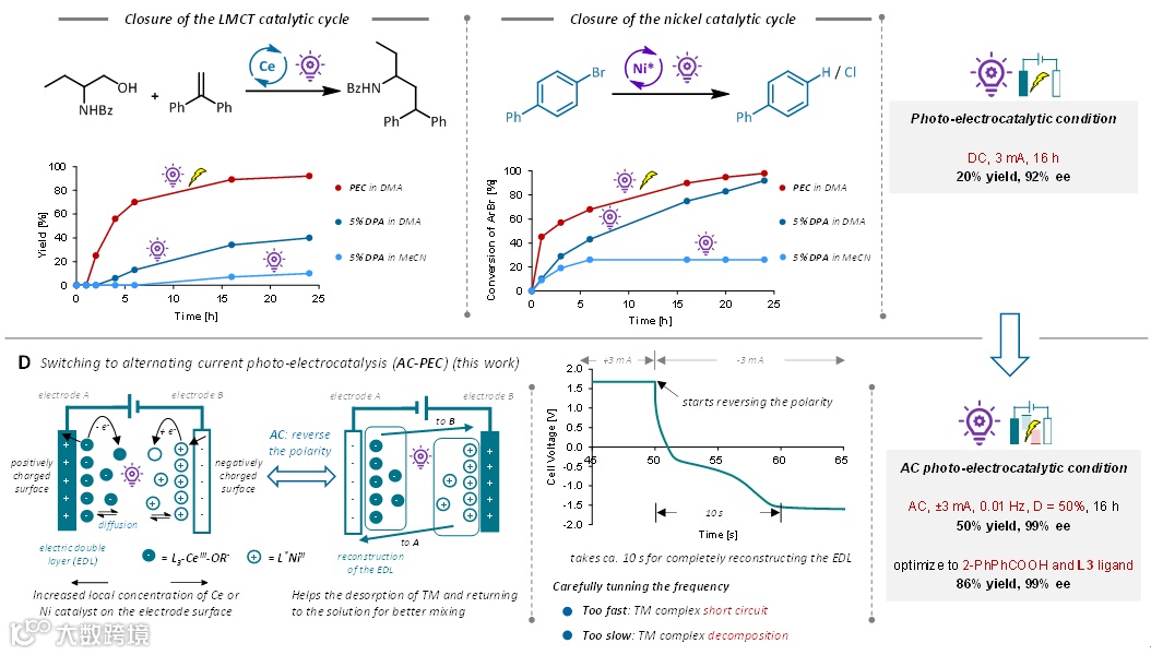 此前,左智伟教授课题组发展了一种基于铈催化LMCT过程的策略,实现了醇的脱羟甲基化芳基化反应,展示了利用廉价、可持续金属催化剂进行有机合成的潜力(J. Am. Chem. Soc. 2021, 143, 4896)。然而,在将该体系发展为不对称催化版本时,作者遇到了反应效率低和对映选择性控制不佳的问题(图1B)。作者转而采用直流光电催化(DC-PEC)。结果表明,PEC平台能更有效地促进铈催化循环和镍催化循环,反应在16小时内即可完成,效率远高于纯光催化体系(图1C)。然而,在直流电作用下,带电的过渡金属催化剂(如Ce、Ni配合物)会因静电作用吸附在电极表面的双电层中并不断积累。这种积累不仅阻碍催化效率,还可能导致金属沉积失活,影响体系稳定性。受雷爱文教授等课题组(Science 2024, 385, 216; Nat. Synth. 2023, 2, 172)在交流电应用于过渡金属催化交叉偶联方面的开创性工作启发,作者采用周期性反转电极极性的策略(即使用交流电)。当电流方向交替变化时,锚定过渡金属配合物的静电相互作用被破坏,促使它们从电极表面解吸并返回到本体溶液中(图1D)。这有效防止了金属配合物的长时间积累,降低了过渡金属分解的风险,从而增强了催化反应的长期性能。经过优化,使用频率为0.01 Hz、占空比为50%的交流电,可将目标产物的产率和ee值分别提高至50%和99%,经过对配体的筛选优化,最终将产率和ee值分别提高至86%和99%。