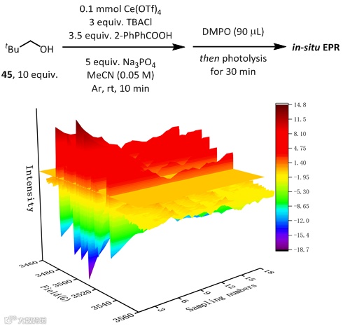 时间分辨EPR(图6):在模型反应体系中,利用DMPO作为自旋捕获剂,探测光照下产生的自由基物种。成功检测到了DMPO-OtBu加合物的特征信号。该信号持续存在,证明了在光照下,Ce(IV)-醇盐络合物通过LMCT过程均裂生成叔丁氧自由基的过程是持续不断发生的。这为LMCT途径提供了直接的光谱证据。