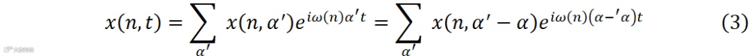 而海森堡的深刻之处在于,他意识到玻恩量子化的方法不仅应用于虚振子的频率,还应该应用于电子本身的运动学,即电子的空间位置x(t)也应该服从玻恩的对应原理[3]。描述虚振子最有效的方法就是傅里叶级数,最重要的一点就是先从半经典电子轨道的谐波傅里叶级数表示开始。对于主量子数为n的轨道上电子(半经典系统对应一个能级),其空间位置可以谐波傅里叶级数表示如下