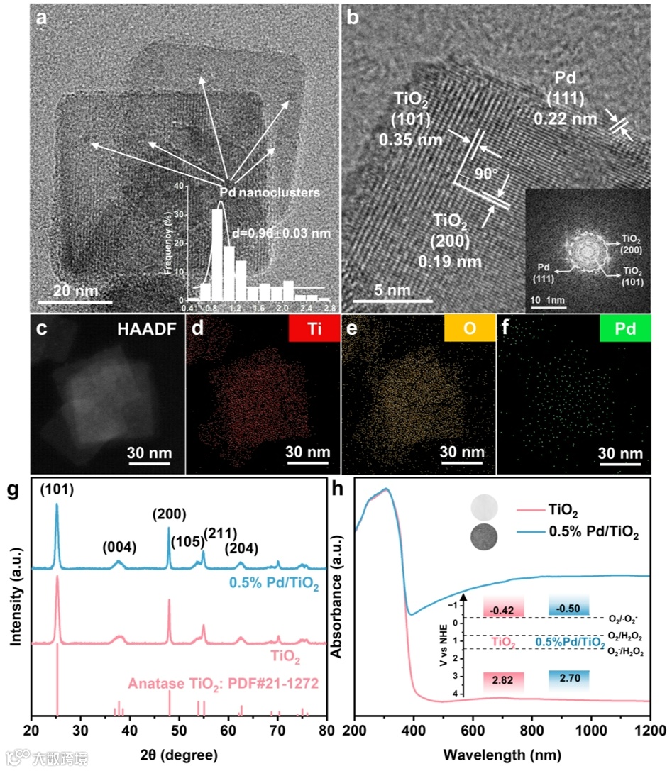 图3 | 光催化剂形貌与结构表征。a 0.5% Pd/TiO2的TEM图;插图为Pd纳米团簇的粒径分布。b 0.5% Pd/TiO2的HRTEM图;插图为相应的FFT图像。c-f 0.5% Pd/TiO2的EDS图。g 原始TiO2与0.5% Pd/TiO2的XRD图。h 原始TiO2与0.5% Pd/TiO2的DRS图;插图为能带结构示意图。