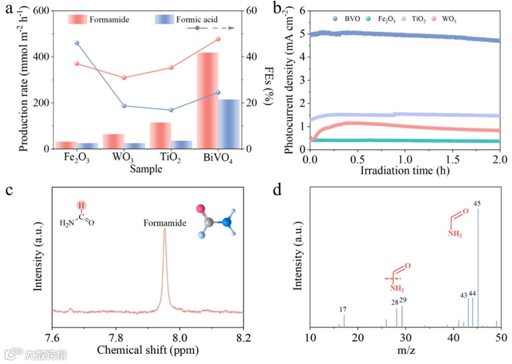 (1) 半导体筛选:葡萄糖(GLU)作为催化反应的模型化合物,这既源于其易于通过纤维素水解获得,也因其广泛存在于自然界,从而便于研究其向上转化过程。首先在50 mM H2SO4电解液(用氨水调节pH值至12,图2a、b)中添加GLU,对半导体(TiO2、WO3、Fe2O3和BVO)光阳极进行初步筛选。通过1H-NM和GC-MS对实验结果进行定量与定性分析(图2c、d),发现相较于其他光阳极,BVO光阳极展现出最高的甲酰胺产率与法拉第效率值。因此,选定BVO作为光电化学C-N偶联反应的模型光阳极。