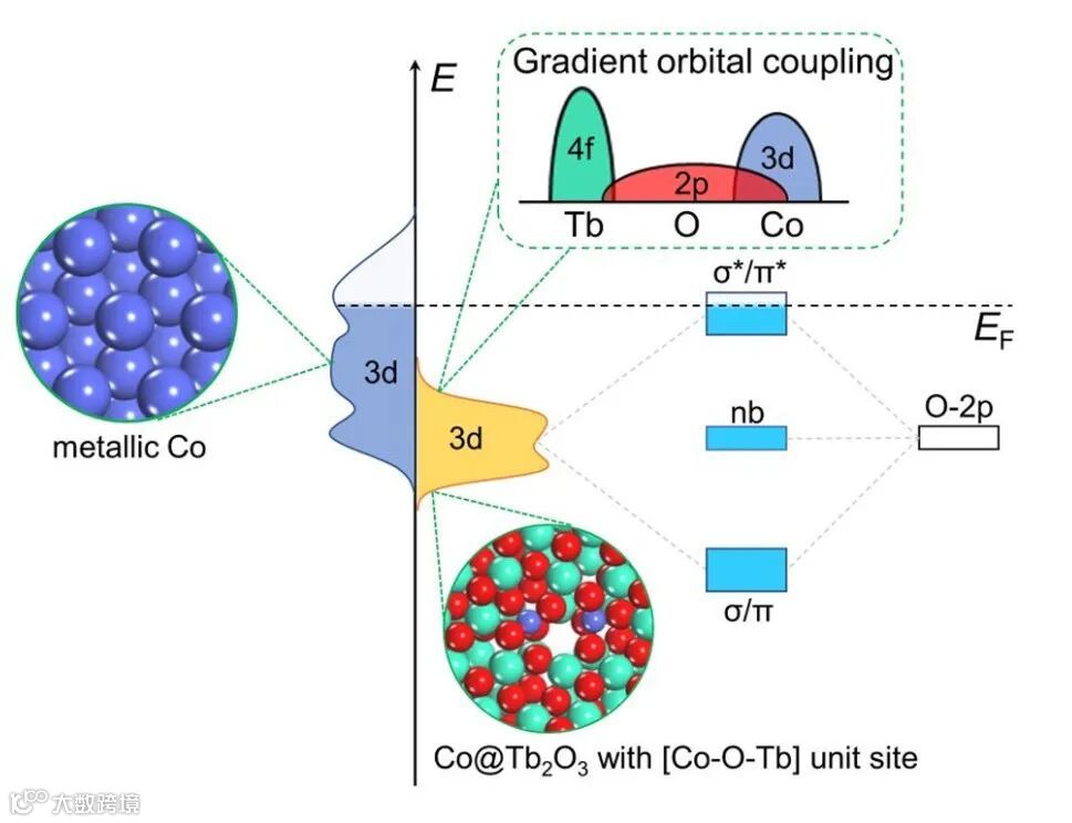 近日,南京师范大学付更涛教授、王彧教授和福州大学的卢雪峰教授等人在Energy & Environmental Science发表论文,该团队开发了一种由Co原子与Tb2O3偶联组成的新型RE基催化剂(Co@Tb2O3),以揭示RE材料在梯度轨道耦合框架之下增强ORR性能的微观作用机制。作者将Co@ Tb2O3锚定在N掺杂碳上,成功用于碱性条件下催化ORR过程以及碱性锌空电池。在Co@ Tb2O3中,Co可以通过与Tb2O3表面晶格O原子的配位实现稳定。通过电化学测试可以发现, Co@Tb2O3/NC能够在O2饱和的0.1 M KOH溶液中拥有1.02 VRHE的起始电位和0.85 VRHE的半波电位,媲美商业化Pt基催化剂并且优于近年来一众报道的Co基催化剂。在碱性水系与固态锌空电池中,也展现出较高的起始电位、功率密度、电池容量以及延长的充放电循环耐久性。密度泛函理论计算表明构建局域化的Co 3d-O 2p-Tb 4f活性基本单元,可以同时实现使Co-3d呈现窄带特征,这种窄带特征可以在活性Co位点与含氧中间体*O结合时产生混杂型σ/π态,进而打破限制氧化原反应过程中的ΔG(*OOH)-Δ(*OH)线性关系束缚,使其更接近理想化的2.46 eV。相关成果以标题为“Terbium-induced cobalt valence-band narrowing boosts electrocatalytic oxygen reduction”发表在RSC旗下能源顶级期刊《Energy & Environmental Science》上。