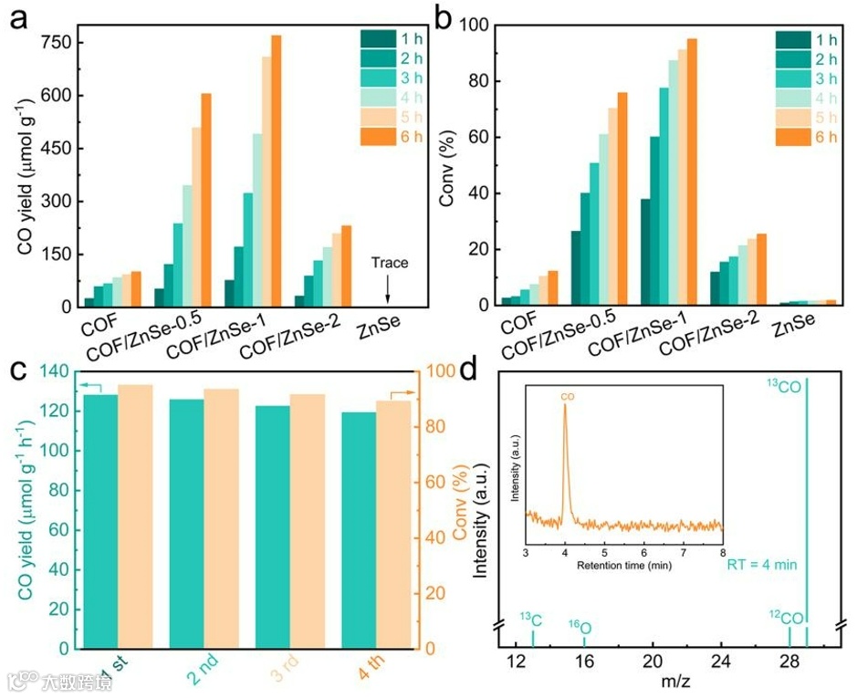 图3. a) 在模拟太阳光照下,COF、复合材料和ZnSe QDs在1-苯乙醇存在下6小时内的光催化CO产率。 b) 1-苯乙醇至1-苯乙酮的转化率。 c) 在COF/ZnSe-1上进行的光催化CO2还原耦合1-苯乙醇氧化的循环测试。 d) 同位素实验的GC-MS分析。