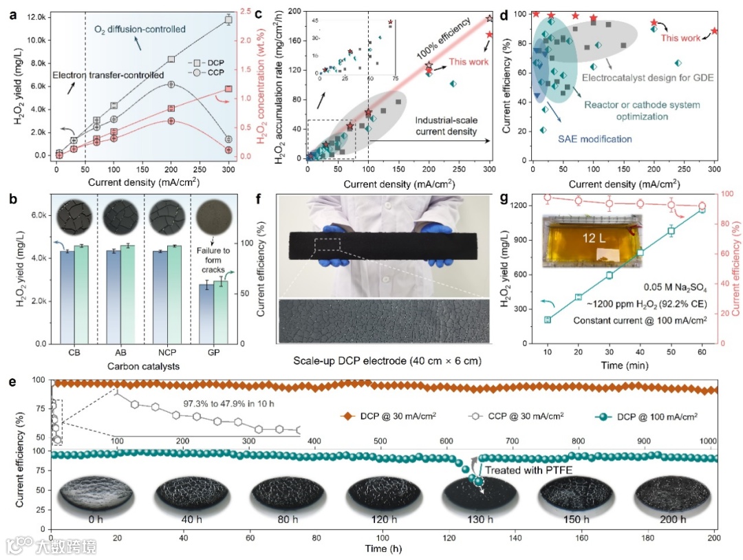 本研究通过在常规CB-PTFE碳膜结构中人为制造非连续式的裂缝展示了一种具有自持曝气的抗电润湿碳膜电极的创新概念,该概念可以通过达成最佳的水/气管理有效避免由电场驱动的润湿(电润湿)现象对电极催化性能的不利影响。CB-PTFE活性层中形成的致密微米级贯穿微裂纹违反直觉地保持独特的坚固的水下疏水性,即便在极具挑战性的高电流密度条件下操作。这种疏水性通过操纵界面附近显著的O2浓度梯度,允许O2从空气通过膜电极持续自扩散至反应界面。重要的是,由结构缺陷处疏水性产生的充满空气的空隙可以有效地捕获O2,产生高的局部O2浓度,进而匹配电子通量,从而在不牺牲选择性的前提下保持高的H2O2产率。COMSOL仿真、水淹驱动力计算和表面微结构分析表明,裂纹介导的抗电润湿效应的潜在机制源于局部电场减小、毛细管压力不足和内表面粗糙度增加。作为这一概念的演示验证,实验室规模的7 cm2 DCP电极在30(100)mA/cm2下可以稳定运行超过1000(200) h,电流效率约为~100%(>97%)。此外,几何面积为240 cm2的放大DCP电极依然能够在100(300)mA/cm2的条件下提供>90%的电流效率超过200(100)小时。本研究证明了一种通过对仅使用商品廉价碳电催化剂组装电极进行简单的疏水性控制来实现工业规模的H2O2电合成的有前景的方法。这种方法是通用多样化的,有潜力推广至其他广谱电化学气耗气反应(如CO2电还原和N2电还原等)。