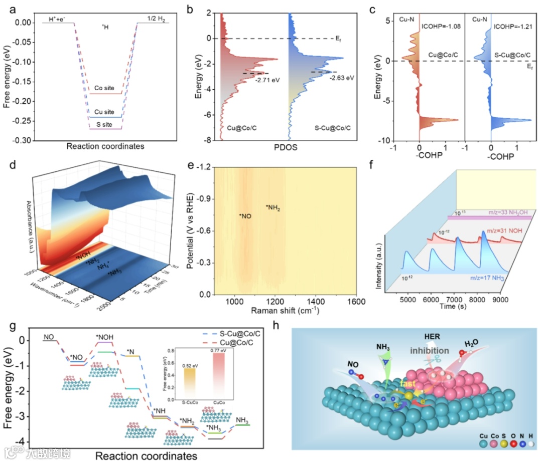 最后,通过理论计算证实了硫对于质子的吸附要强于金属铜和钴,这有利于钴位点上产生的质子及时转移至硫位点,进而到铜上进行NO氢化。而硫的引入通过影响金属的d带中心,从而导致金属位点对于反应物的吸附增强。结合ATR-IRAS、原位差分电化学质谱(DEMS)以及原位拉曼对反应中间体进行了监测,明晰了NO到NH3的路径为氧端加氢的过程,并通过理论计算进行了证实。