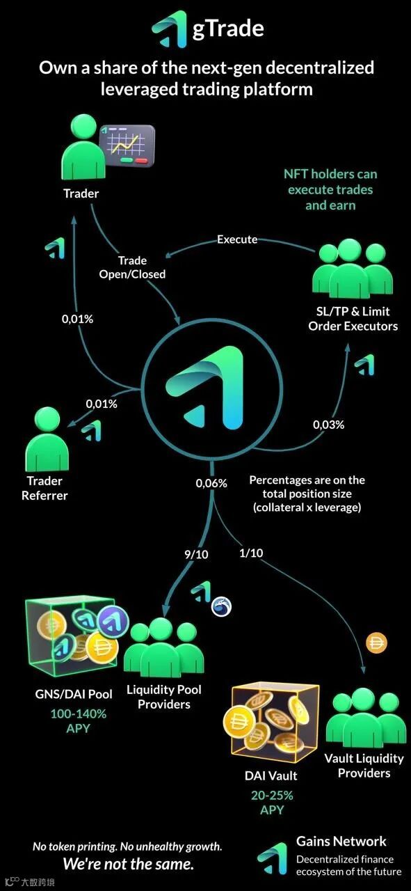 GNX是Gains Network平台的本地通证,主要用于支付交易费用、激励提供流动性的用户和奖励持有者。GNX持有者可以参与平台的治理和决策过程,并享受平台的收益。GNX还可以用于访问平台的高级功能和特殊服务。平台将在未来继续开发新的用途和功能来增加GNX的实用性和需求。