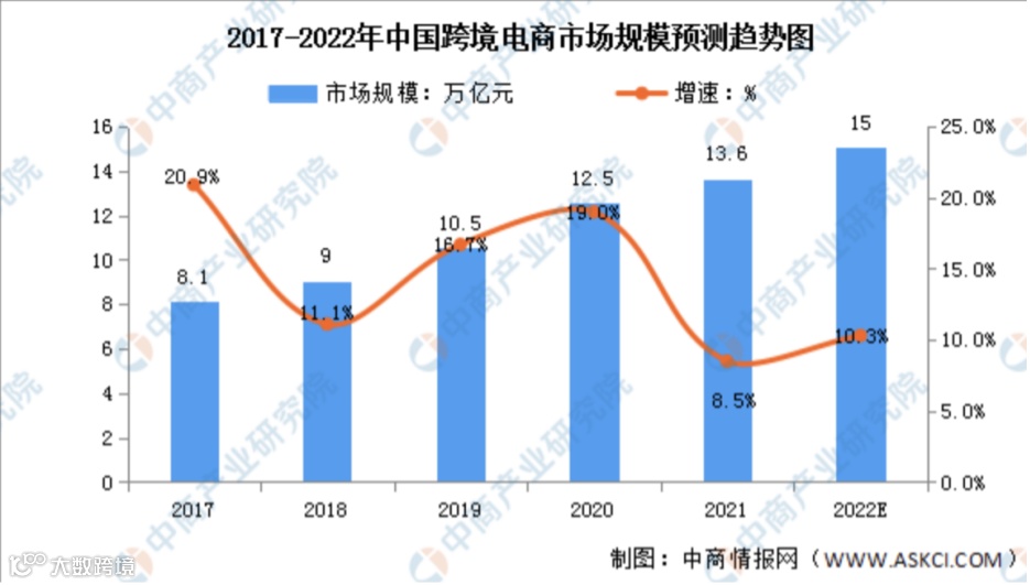 除此之外,全球都受到Covid-19的影响,导致2020年以来,消费者的消费渠道由实体店,大规模的转移到线上。中商产业研究院预测,2022年中国跨境电商市场规模将达15万亿元。