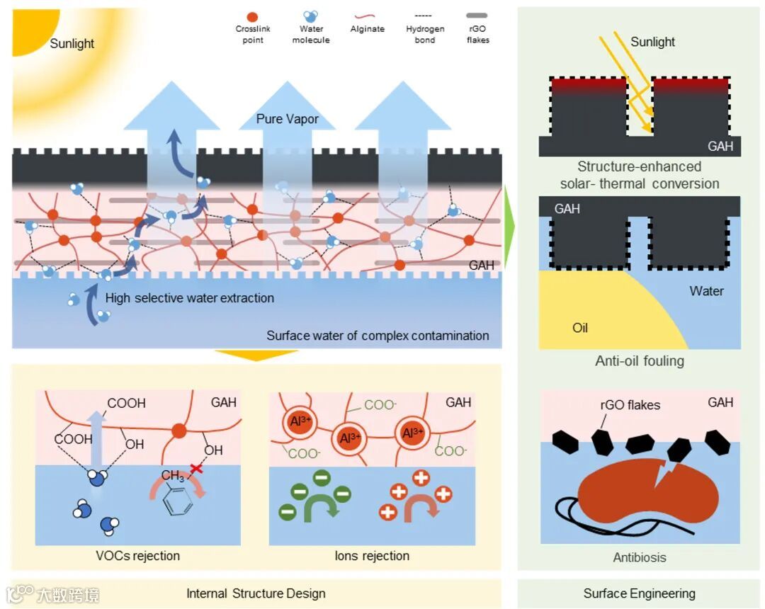 光热水净化技术以太阳能为驱动力,具有可持续、碳中和、低成本的优势,是解决全球水资源危机的重要策略之一。其净化原理主要基于热蒸馏过程,而地表水体中存在着复杂污染物,难以通过简单蒸馏的方式完全净化,残留的污染物被饮用后会严重损害人体健康。同时,复杂污染水体会造成膜体的污染,影响其功能稳定与应用。近日,清华大学化学系曲良体教授团队与合作者开发了一种多功能光热水净化凝胶膜,能够利用太阳能直接从受污染的地表水中获取清洁水蒸气,产生可饮用的淡水。该水净化策略能直接排除有机物、无机物、细菌、盐、油等对水蒸气和膜体的污染,为高效光热海水淡化等领域的发展和应用提供新思路。相关研究成果以“ Multifunctional solar water harvester with high transport selectivity and fouling rejection capacity ”为题,发表于Nature Water 期刊。论文第一作者为清华大学化学系博士生郝轩章,通讯作者为清华大学教授曲良体、助理研究员程虎虎以及瑞典斯德哥尔摩大学教授袁家寅。该研究依托于清华大学有机光电子与分子工程教育部重点实验室、摩擦学国家重点实验室开展,获得了国家自然科学基金委、清华-佛山先进制造研究院等的支持。