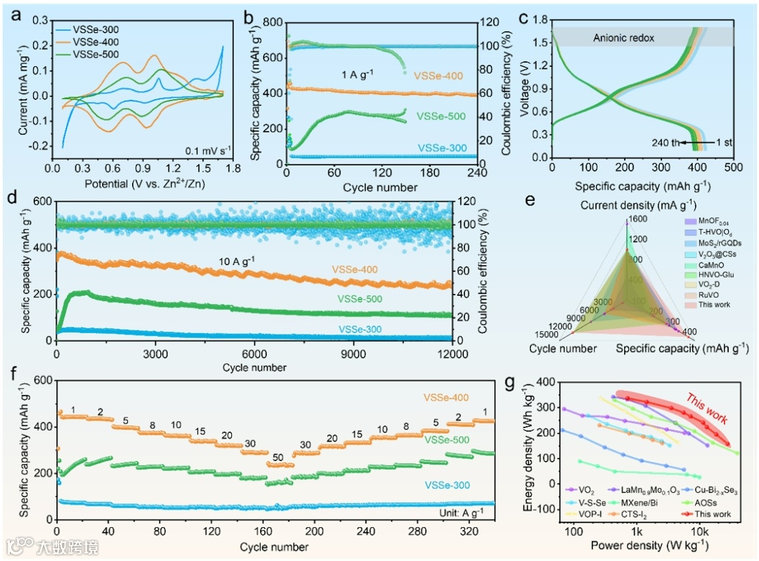 为了评估阴极材料的电化学性能,在0.1-1.7 V的电位范围内进行了测试。CV测试结果显示,VSSe-400具有较大的CV面积和较小的电压间隙,表明其具有更好的电化学可逆性和反应动力学。充放电测试表明,VSSe-400在不同电流密度下都表现出了优异的容量和循环稳定性。在1 A g-1的电流密度下,VSSe-400的可逆容量达到432 mAh g-1,在10 A g-1下循环12000次后仍保持较高的容量。此外,VSSe-400还具有出色的倍率性能,在50 A g-1的高电流密度下,容量仍能保持在237 mAh g-1,且当电流密度从50 A g-1返回1 A g-1时,可逆放电容量可恢复96.1%。