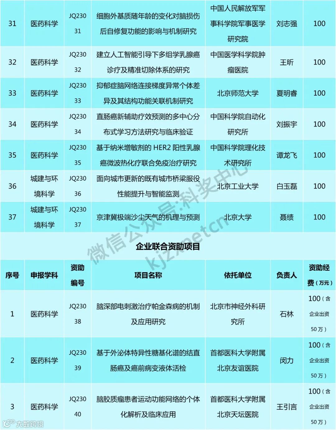 市自然科学基金委员会办公室依据《北京市自然科学基金管理办法》等有关规定,完成了2023年度北京市自然科学基金杰出青年科学基金、重点研究专题、小米创新联合基金项目的项目评审工作。经公示,决定资助2023年度杰出青年科学基金项目40项,资助总经费4000万元,其中企业联合资助项目3项,企业出资150万元;资助2023年度重点研究专题项目24项,资助总经费6750万元;资助2023年度小米创新联合基金项目39项,其中重点研究专题项目9项,前沿项目30项,资助总经费5988.71万元。